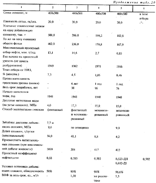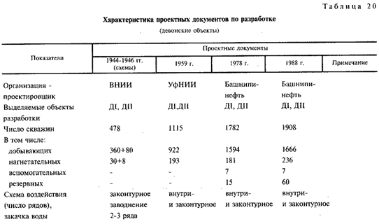 В 1987 г. составлен новый проект разработки месторождения. Он каких-либо существенных изменений в сложившуюся систему разработки не вносил и рекомендации сводились к небольшим изменениям в системе заводнения. Единственным принципиально новым положением этого проекта является снижение объемов закачки до меньшего уровня, чем отбирается жидкости, с тем, чтобы использовать накопленный упругий запас энергии пласта. Проект утвержден в 1988 г. и разработка месторождения осуществляется по этому документу (рис. 76 и 77). Характеристика основных проектных документов девонских объектов приведена в табл. 20.