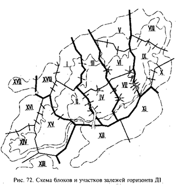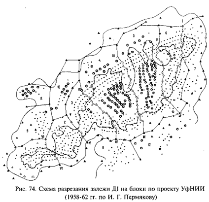 Как уже отмечалось выше, решающее влияние на разработку ДI и ДІI оказала выявившаяся гидродинамическая связь между ними. Все дальнейшие мероприятия сводились к ликвидации этого перетока. С этой целью проектом 1959-62 гг. предусматривалось внутриконтурное заводнение. В начальной стадии реализации этого решения заводнение осуществлялось в зонах перетока. Постепенно залежь ДI разрезалась на отдельные блоки уже и там, где перетоков не было. На более поздней стадии разукрупнялись и блоки.