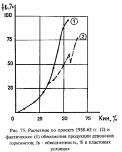 Начиная с 1966 г. начались существенные отклонения фактических показателей от проектных. Прежде всего это касается обводнения продукции (рис. 75). Постепенно эти отклонения нарастали. В 1980 г. при расчетной обводненности 63% фактическая составляла более 90%. Такая разница объясняется несовершенством методики расчетов этого параметра.