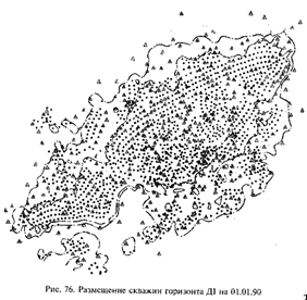 Плотность сетки выбрана с учетом существующей девонской системы добывающих скважин с тем, чтобы вписаться в нее по мере их возврата (400х500) (рис. 78).