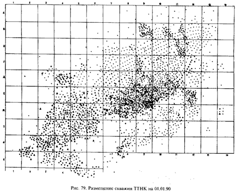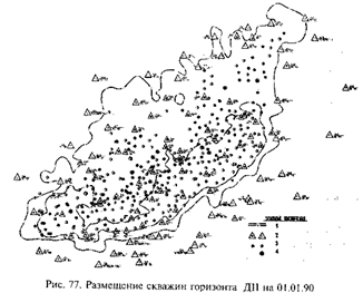 В 1987 г. в новом проекте разработки залежей нижнего карбона рассмотрено 3 варианта. В принятом II варианте запроектировано площадное заводнение турнейского объекта по пятиточечной системе. Однако решения эти до настоящего времени не реализованы и разработка объекта осуществляется единичными скважинами. Состояние фонда скважин объектов нижнего карбона приведено на рис. 79.