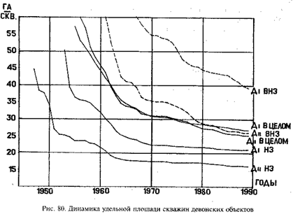 Редкая сетка по обоим объектам сложилась на водонефтяных зонах. Особенно большие различия наблюдаются по горизонту ДI. На отдельных блоках УПС (в целом) изменяется от 17 до 54 га. По ВНЗ эти различия еще больше - от 27 до 243 га/скв. Вследствие такой редкой сетки нефтеотдача водонефтяных зон намного ниже, чем в чисто нефтяной части залежей. Предпринятые меры по разбуриванию этих зон сильно запоздали и оказались низкоэффективными.