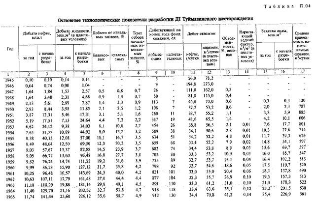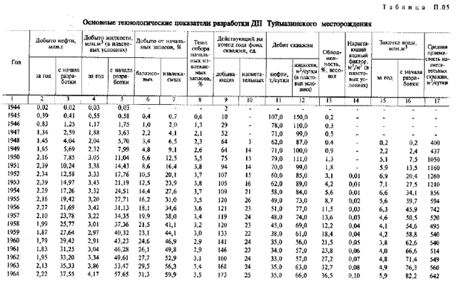 Разработка этих залежей осуществлялась с разной интенсивностью во времени. В 1937-44 гг. до открытия девонских продуктивных горизонтов в эксплуатации находились два небольших участка на Туймазинской площади, на которых пробурено около 70 скважин. Из них в 1944 г. в фонде действующих было всего 52 скважины, в том числе только на бобриковский горизонт - 11, на турнейский объект - 4 и 37 скважин эксплуатировали оба объекта вместе. Понятно, в те годы никакого проекта разработки не было так же, как и воздействия на продуктивные пласты. В 1944 г. из этих скважин добыто 81,6 тыс. т или 224 т/сутки, при среднем дебите - 4 т/сутки.