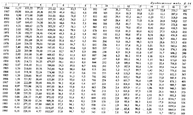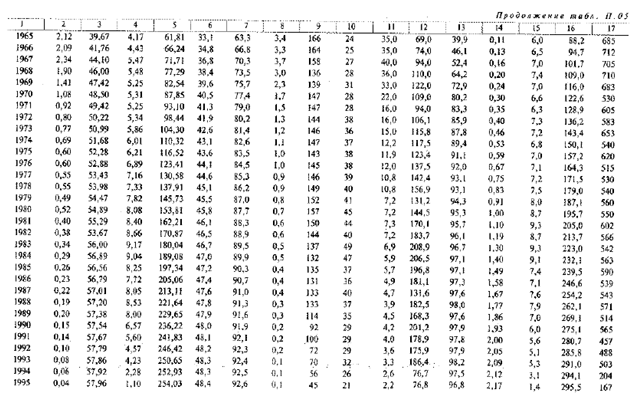 В конце 1967 г. началось резкое падение добычи нефти. Этот год и является началом третьей, поздней стадии разработки месторождения. К началу падения уровня добычи было отобрано 68,0% НИЗ (40,4% НБЗ), обводненность составляла 58%. Как видно из этих данных, снижение уровня добычи нефти произошло после отбора двух третей извлекаемых запасов. По этому показателю Туймазинское месторождение выгодно отличается от многих других. По Серафимовскому месторождению максимальная добыча была при отборе 55% НИЗ, по Шкаповскому, Бавлинскому - еще раньше. Темп обводнения возрос с 5,6 в 1965 г. до 7,8% в 1967 г. Темп падения добычи нарастал в течение 3-х лет и составил по ДI за первый год - 6,9, за второй - 18,8, за третий - 26,9% и только с четвертого года постепенно начал уменьшаться.