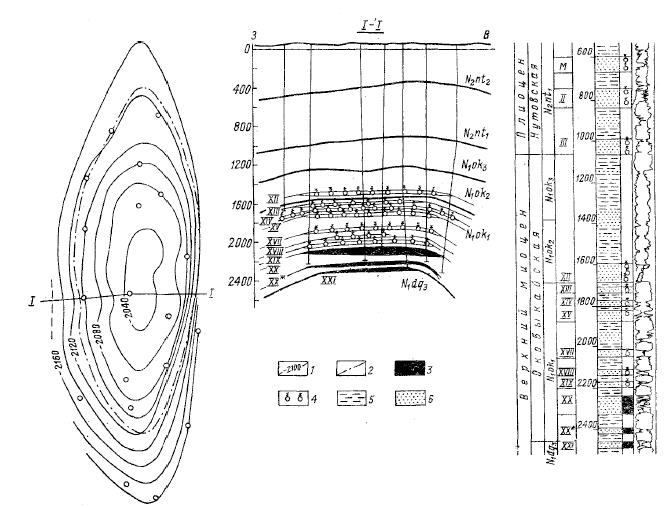 Рис. 1. Газонефтяное месторождение Тунгор. 1-изогипсы по кровле XX пласта, 2- контур нефтеносности, 3- нефть, 4- газ, 5- глинистые, 6- песчаные породы