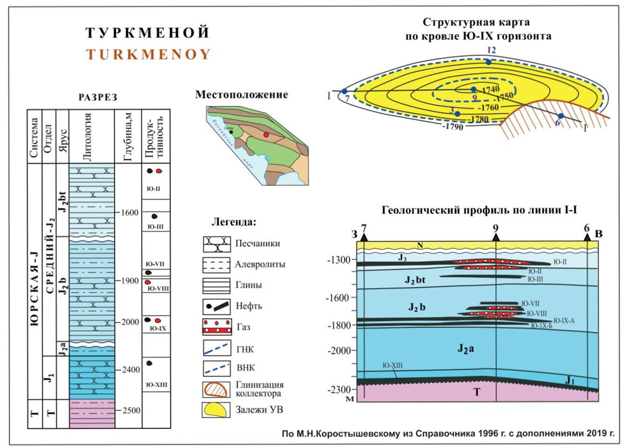 Нефтегазовое месторождение Туркменой находится в Мангыстауской НГО и расположено на северо-востоке Жетыбай-Озенской ступени, на продолжении на запад Озенской зоны. Первооткрывательницей является скважина 3, установившая в 1969 году продуктивность горизонта Ю-IX в байосском ярусе. В структурном отношении месторождение приурочено к асимметричной брахиантиклинальной складке субширотного простирания. По кровле батских отложений складка имеет размеры 4,4 км и амплитуду до 30 м.