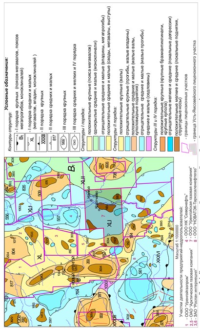 На территории Усть-Ямсовейского лицензионного участка выделяются следующие структуры I порядка(рис.1): на западе – Уренгойский мегавал, в центральной части – Нижнепурский мегапрогиб и Хадырьяхинская моноклиналь на востоке. В пределах этих структур выделяются более мелкие положительные структуры 3-го порядка: Северо-Пырейное (индекс 1505) и частично Морозное (индекс 3034) на западе, Усть-Ямсовейское (индекс 1664), Западно-Геологическое (индекс 3953) на востоке. На периферии юго-западной части ЛУ располагается структура II порядка – Пырейный структурный мыс (индекс 184), в пределах которого ближайшими к ЛУ являются Южно-Уренгойское (индекс 942) и Пырейное (индекс 943) поднятия.