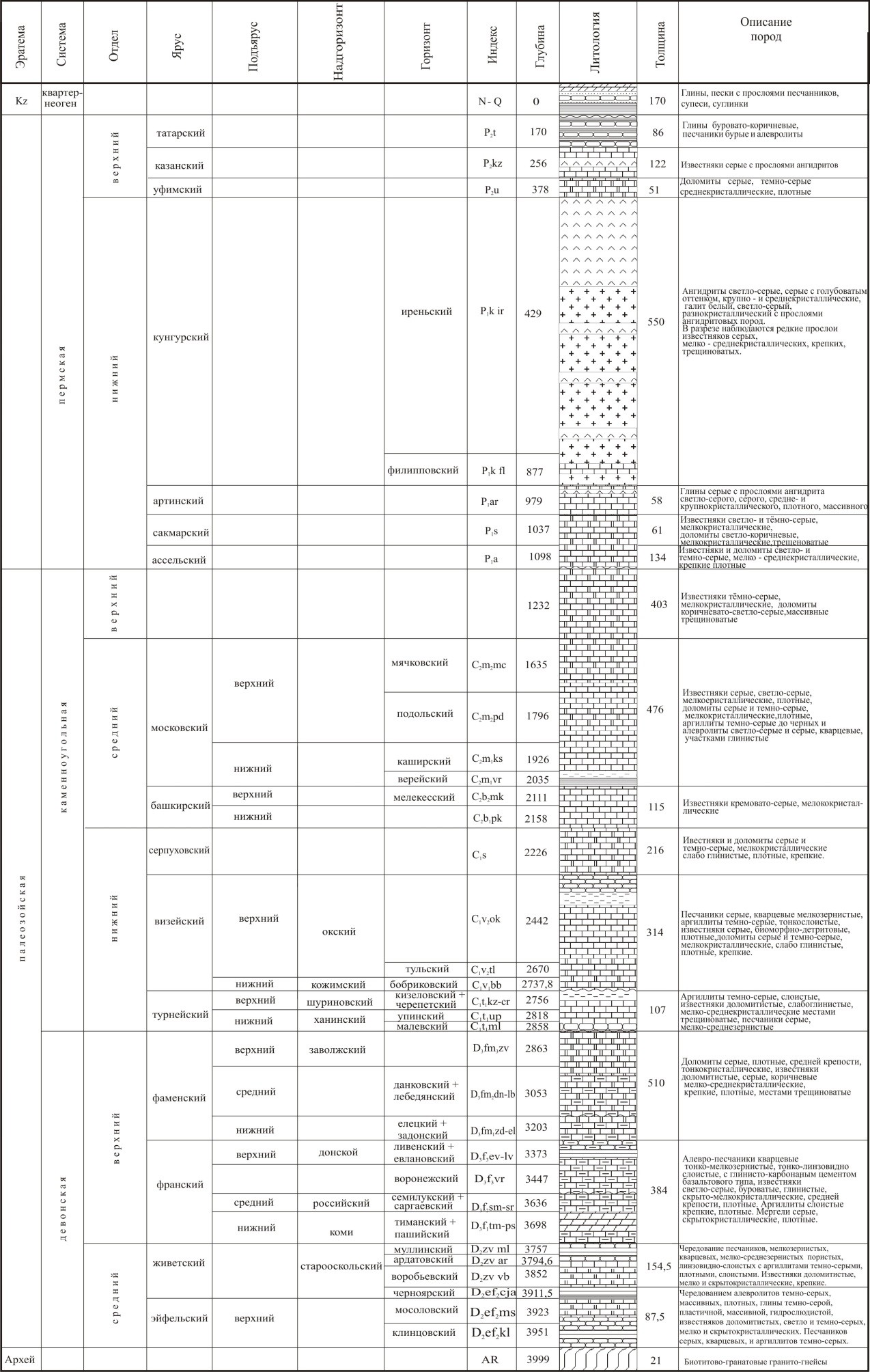 Геологический разрез Ушаковской площади сложен осадочными породами девонской, каменноугольной, пермской систем и кайнозойской эратемы. Осадочная толща залегает на архейском кристаллическом фундаменте и имеет мощность 4020 м. Сводный литолого-стратиграфический разрез приведен на рисунке 2.