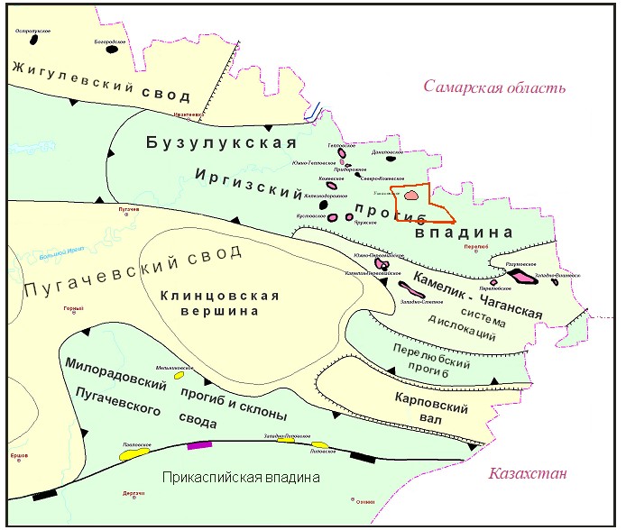 В тектоническом отношении Ушаковское месторождение расположено в зоне сочленения северо-восточного склона Клинцовской вершины и Иргизского прогиба с западным бортом Бузулукской впадины.