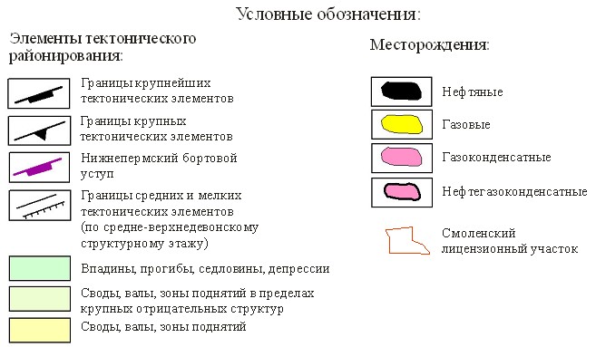 Согласно структурным построениям, выполненным на основе материалов сейсморазведочных работ МОГТ, в пределах Смоленского лицензионного участка по отражающим горизонтам девона выделяется ряд структурных объектов: Смоленская группа поднятий включает в себя собственно Смоленское и Южно-Смоленское поднятия.