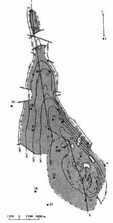 Рис. 1. Усинское нефтяное месторождение. Структурная карта кровли проницаемых песчаников «основной» толщи среднедевонских отложений.