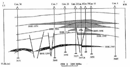 Песчаники «основной» толщи и «верхней» пачки, залегающие на глубинах от 1950 до 3250 м, составляют единый резервуар пластового типа с общей поверхностью ВНК. Покрышкой являются глины тиман-