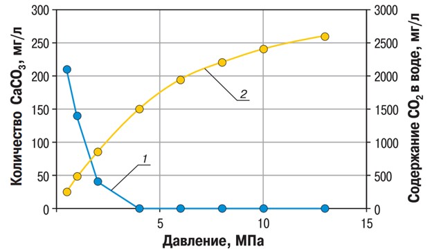 Рис. 1. Расчетное количество образующегося CaCO3 (1) и содержание СО2 в воде месторождения Варадеро (2) в зависимости от давления в системе пластовая нефть – газ – вода при температуре 65 °С