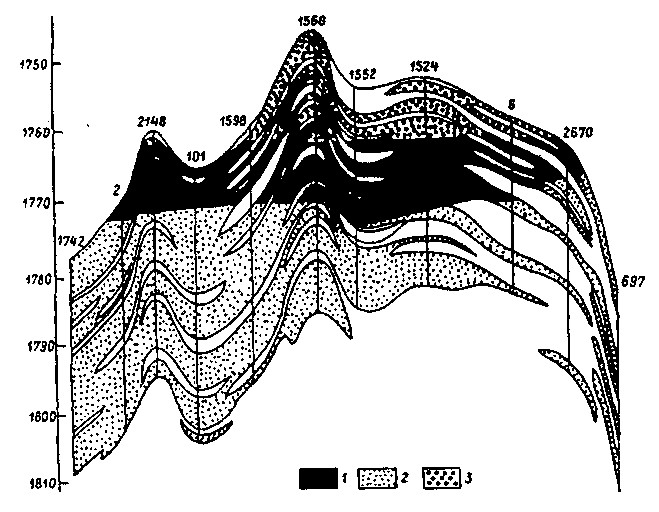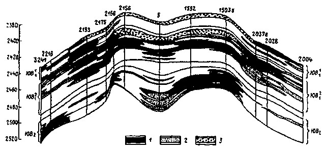 Рис. 1. Варьеганское нефтегазоконденсатное месторождение. Геологический разрез пластов АС7-8: 1, 2, 3 — нефте-, водо-, газонасыщенный песчаник