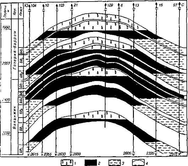 Рис. 2. Варьеганское нефтегазоконденсатное месторождение. Геологический разрез: 1 — газ; 2 — нефть; 3 — вода; 4 — глина