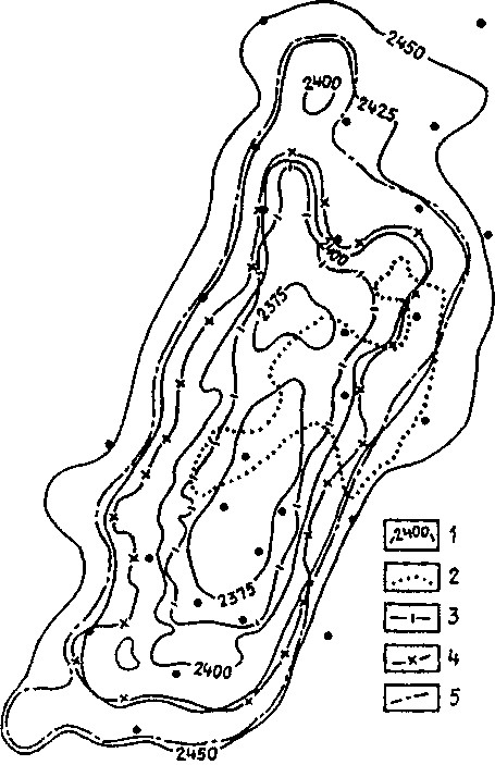 Рис. 3. Варьеганское нефтегазоконденсатное месторождение. Структурная карта кровли пласта ЮВ: 1 — изогипсы кровли пласта Ю,1; 2, 3, 4, 5 — внешние контуры газо-, нефтеносности соответственно пластов АВ4, ЮВ2, ЮВ12, ЮВ11.