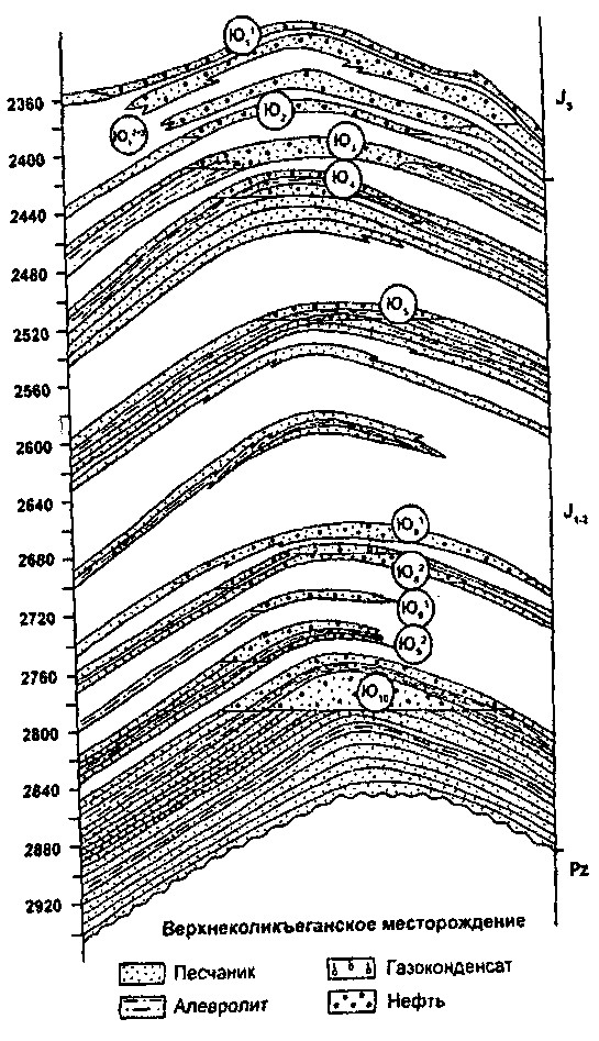 Верхнеколикъеганское нефтегазоконденсатное месторождение (рис. 1), расположено в 240 км от г. Нижневартовск. Открыто, в 1981 г. (нефть), в 1987 г. (газ) разрабатывается с 1990 г. Приурочено к крупному куполовидному одноименному поднятию северо-восточного простирания, осложняющему северную периклиналь Александровского мегавала. По замкнутой изогипсе -2500 м горизонта Б (кровля баженовской свиты) размеры 54x27 км, амплитуда 175м. Западное крыло поднятия пересечено тектоническим нарушением. Осложнено семью куполами. Нефтегазоносность установлена в отложениях от верхнего мела до нижней юры: выявлено 53 залежи на гл. 842—2873 м (нефтяных 25, газовых 8, смешанных 20). Среди них нефтяные в пластах покурской свиты апт-сеноманского возраста (ПК6, ПК013), в неокомских шельфовых (АВ, БВ) и клиноформных ачимовских (I, II, III, IV), верхне- (Ю1) и средне-нижнеюрских (от Ю2 до Ю10) отложениях. Газовые и нефтегазовые в пластах турона, альба, апта, неокома (Т, ПК11 - ПК14, ПК16 - ПК22, АВ1 -АВ3, БВ1 - БВ3, БВ6, БВ9, БВ,10 нефтегазоконденсатные в пластах неокома (БВ211, БВ113, БВ14). Продуктивные отложения представлены преимущественно песчаниками, местами переслаивающимися с алевролитами и глинами. Коллекторы перового типа, пористость от 15 до 34%, залежи пластовые сводовые, ВНК и ГВК на а.о. от -755 до -2785 м. Наибольшая по площади и запасам залежь нефти в пласте Ю2-31 — 91,1 км2, из которой ведется добыча нефти, дебиты нефти от 0,3—84,3 до 89— 113 м3/сут, газа 189,2—220 тыс. м3/сут. Пластовое давление нормальное гидростатическое, t на гл. 2873 м — 92°С, плотность нефти от 740 до 939 кг/м3, конденсата 740 кг/м3. Выход стабильного конденсата от 47,8—372г/м3.