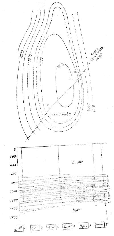 Рис. 1. Восточно-Луговское газовое месторождение. 1- изогипсы по кровле VIII горизонта (продуктивного), 2 — предполагаемый контур газоносности, 3- залежи газа; 4- маруямская свита; 5- невельская свита; 6 —линия размыва.