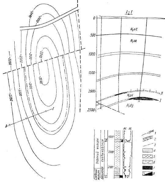 Рис.1. Газонефтяное месторождение Восточное Даги. 1- изогипсы по дагинской свиты, 2- разрывы, 3- контур нефтегазоносности,4,5,6- песчаные, глинистые и песчано-глинистые породы, 7- нефть, 8- нефть и газ