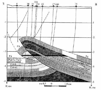 Рис. 2. Вуктыльское нефтегазоконденсатное месторождение. Геологический разрез по линии скважин 6-58-11-224-153-43-17-188-34 (по В. В. Шелгунову).