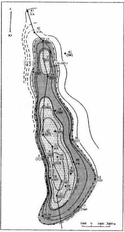 Рис.1. Хыльчуюское нефтегазоконденсатное месторождение. Нефтегазоконденсатная залежь в отложениях Р1ar. Структурная карта кровли проницаемых карбонатов артинского яруса нижней перми (Пилосова и др., 1995 г.).