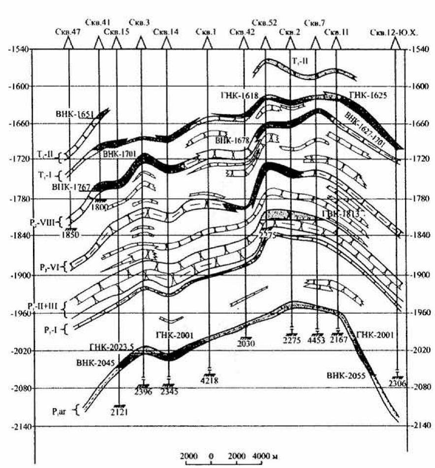 Рис. 2. Хыльчуюское нефтегазоконденсатное месторождение. Геологический разрез продуктивных триасово-пермских отложений по линии скважин 47-41- 15-3-14-1-42-52-2-7-11-12 (Пилосова и др., 1995 г.).