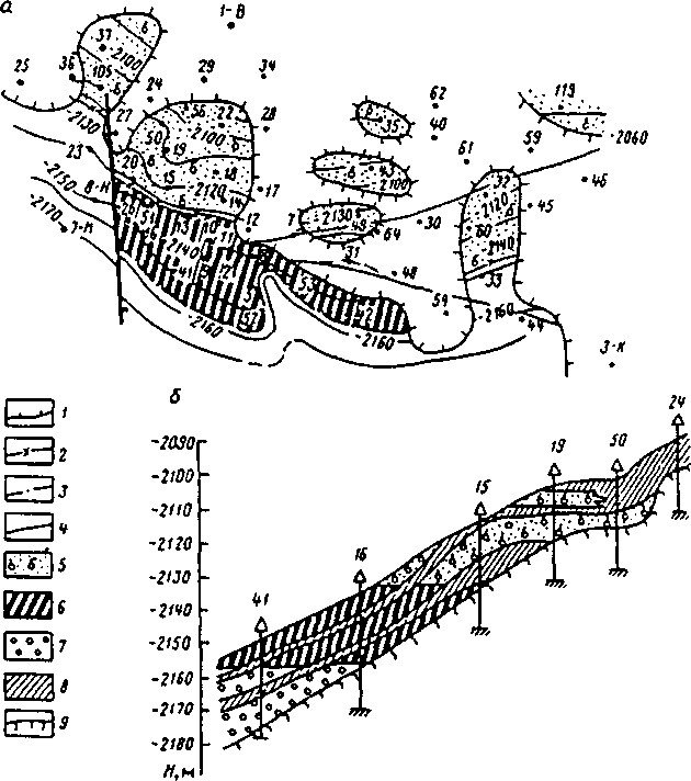 а — структурная карта по кровле коллекторов ярактинской пачки; б — геологический разрез продуктивного горизонта; 1 — граница зоны распространения коллекторов; 2 — внешний контур газоносности; 3 — внешний контур нефтеносности; 4 — линии дизъюнктивных нарушений; коллекторы: 5 — газонасыщенные, 6 — нефтенасыщенные, 7 — водонасыщенные; 8 — непроницаемые породы; 9 — кристаллический фундамент