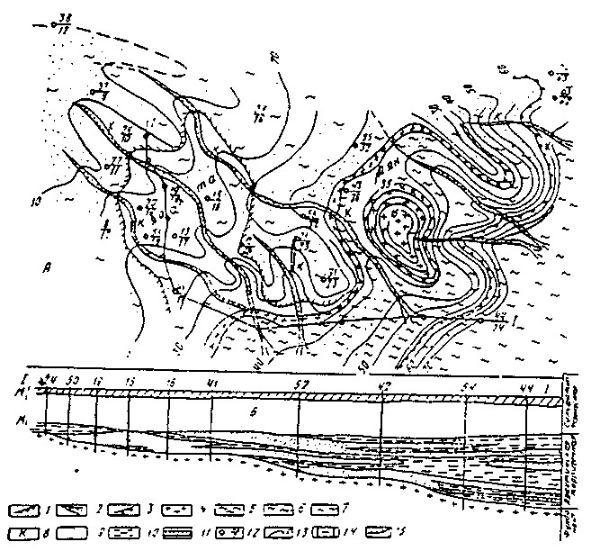 Выработанный рельеф. До начала трансгрессии: 1 — морской подводный склон; 2 — русловые протоки; на начальном этапе трансгрессии: 3 — береговой уступ; 4 — структурно-денудационный останец. Аккумулятивный рельеф; равнины: 5 — морская глубоководная; 6 — прибрежно-морская мелководная в начале трансгрессии; 7 — аллювиально-морская максимального развития трансгрессии (подводная дельта); 8 — конгломераты и галька в основании ярактинской пачки; 9 — породы-коллекторы; 10 — флюидоупоры; 11 — реперный горизонт; 12 — скважины (в числителе — номер, в знаменателе — толщина ярактинской пачки, м); 13 — изопахиты ярактинской пачки; 14 — линия профиля; 15 — контур нефтегазоносности