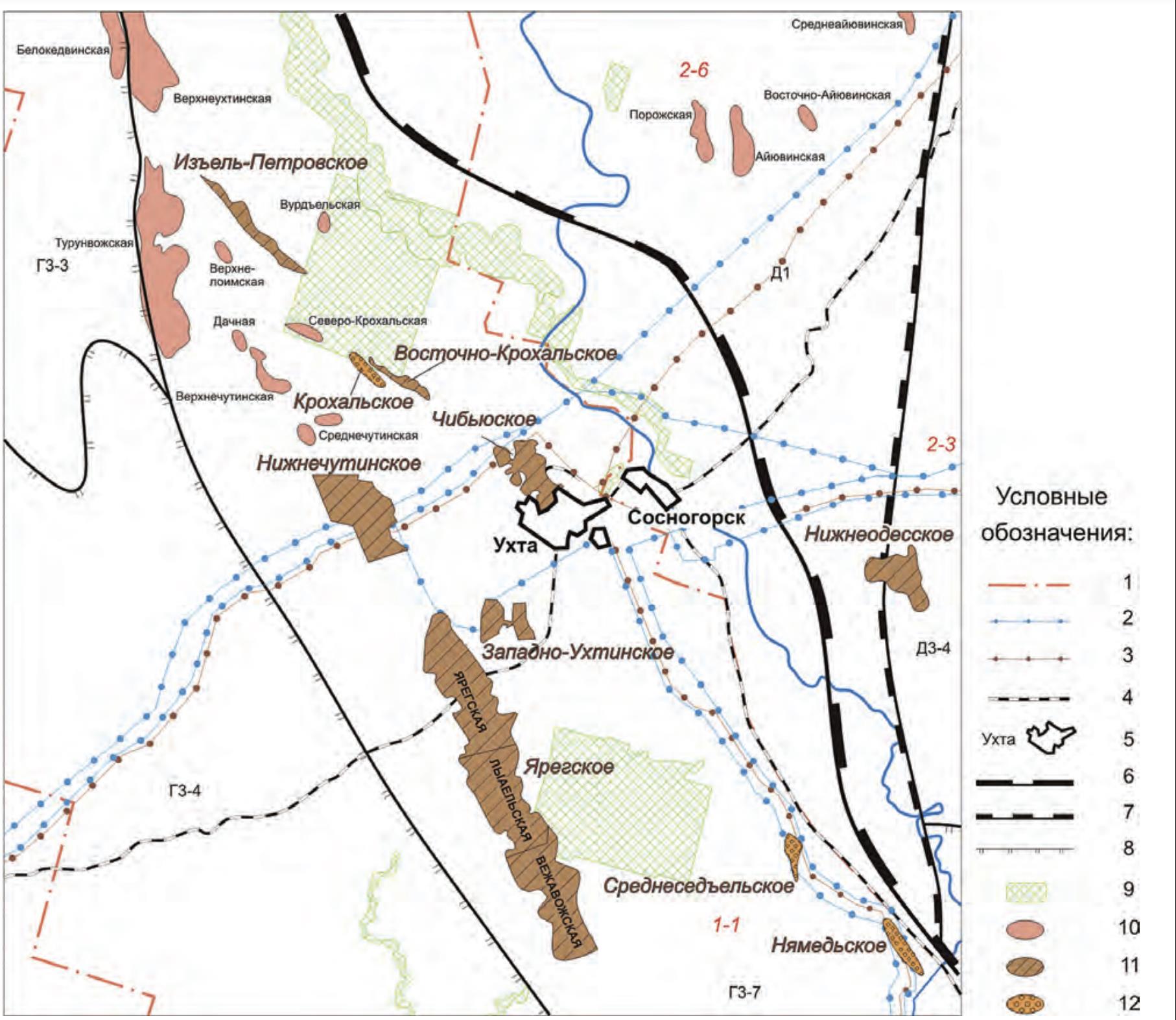 1 — границы административных районов; 2 — нефтепровод, 3 — газопровод, 4 — железная дорога, 5 — населенные пункты; границы тектонических элементов: 6 — надпорядковых, 7 — первого порядка, 8 — второго порядка; 9 — заповедник комплексный; 10 — выявленные структуры; 11—12 — месторождения: 11 — газовые, газоконденсатные, 12 — нефтяные. Нефтегазогеологическое районирование: 1-1 — Ухта- Ижемский НГР, 2 — Ижма-Печорская НГО, 2-3 — Велью-Тэбукский НГР, 2-6 — Тобышско-Нерицкий НГР. Элементы тектонического районирования: Г — Тиманский кряж, Г3 — Восточно-Тиманская структурная зона, Г3-1 — Вымский вал, Г3-3 — Эшмесская ступень, Г3-4 — Тобысьская депрессия, Г3-7 — Ухта-Ижемский вал, Д — Ижма-Печорская синклиза, Д1 — Нерицкая ступень, Д3-4 — Тэбукская ступень