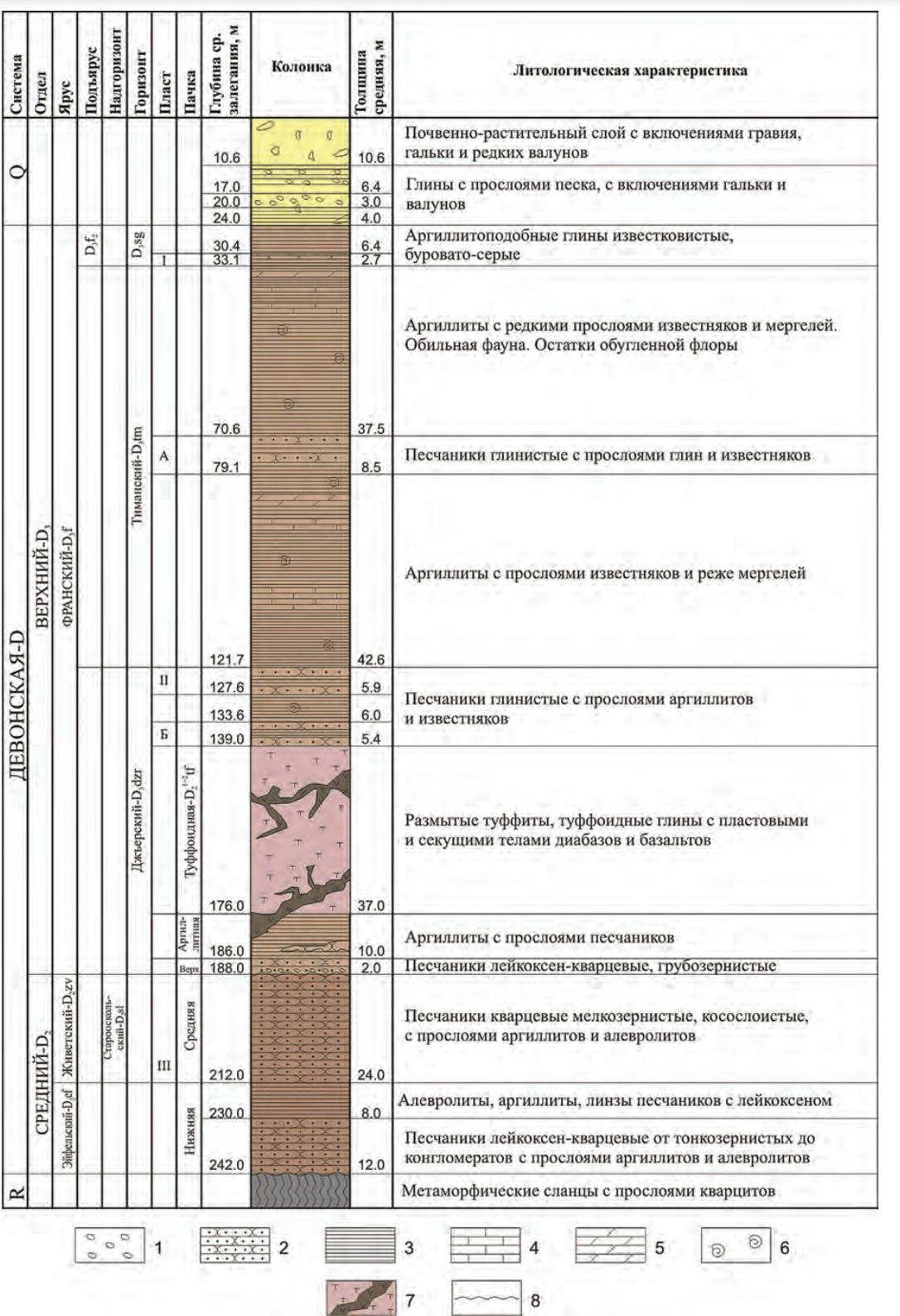 1 - включения гравия и гальки, 2 - песчаники, 3 - алевролиты и аргиллиты, 4 - известняки, 5 - мергели, 6 - фауна, 7 - туффоидный горизонт, сложенный туфами и диабазами, 8 — поверхность несогласия
