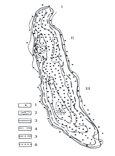 1 - пробуренные скважины; 2 - изогипсы кровли тульского горизонта; 3, 4, 5 - внешние контуры нефтеносности эксплуатационных объектов соответственно яснополянского, башкиро-серпуховского, турнейского; 6 - внешние контуры газовых шапок башкирского и серпуховского ярусов (I, II, III)