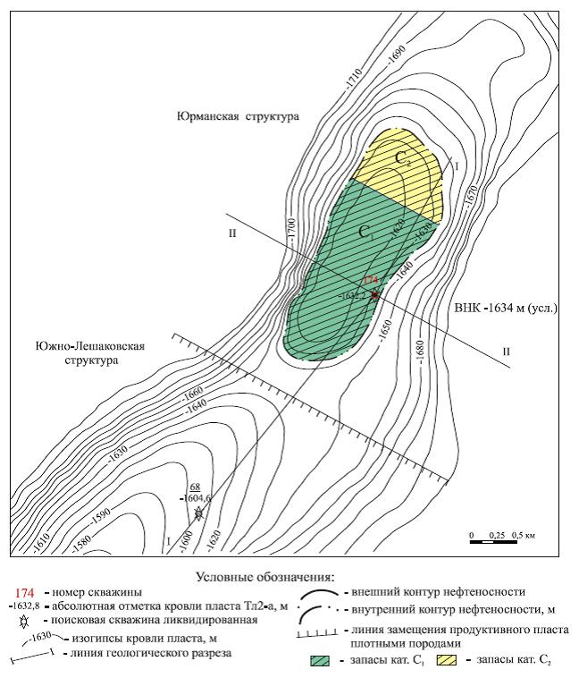 По кровле нефтяного пласта Тл2-а Юрманская структура представляет собой брахиантиклиналь северо-восточного простирания (рис. 1), которая имеет овальную в плане форму, немного расширяющуюся с юго-запада на северо-восток. Размеры структуры по замкнутой изогипсе -1640 м составляют 2.9×0.88-1.14 км, амплитуда 23.6 м. По кровле нефтяного пласта Тл2-б размеры структуры по замкнутой изогипсе -1660 м немного увеличиваются до 3.0×0.94-1.2 км, амплитуда составляет 24.6 м. В поперечном сечении Юрманское поднятие является асимметричным и имеет более крутое северо-западное крыло (от 13º в южной половине структуры до 7º в северной) и пологое юго-восточное крыло (от 5º в южной половине до 6º38' в северной). Юго-западная периклиналь антиклинали характеризуется более крутым погружением шарнира под углом 3º48'. На северо-восточной периклинали шарнир погружается под углом 2º34'.