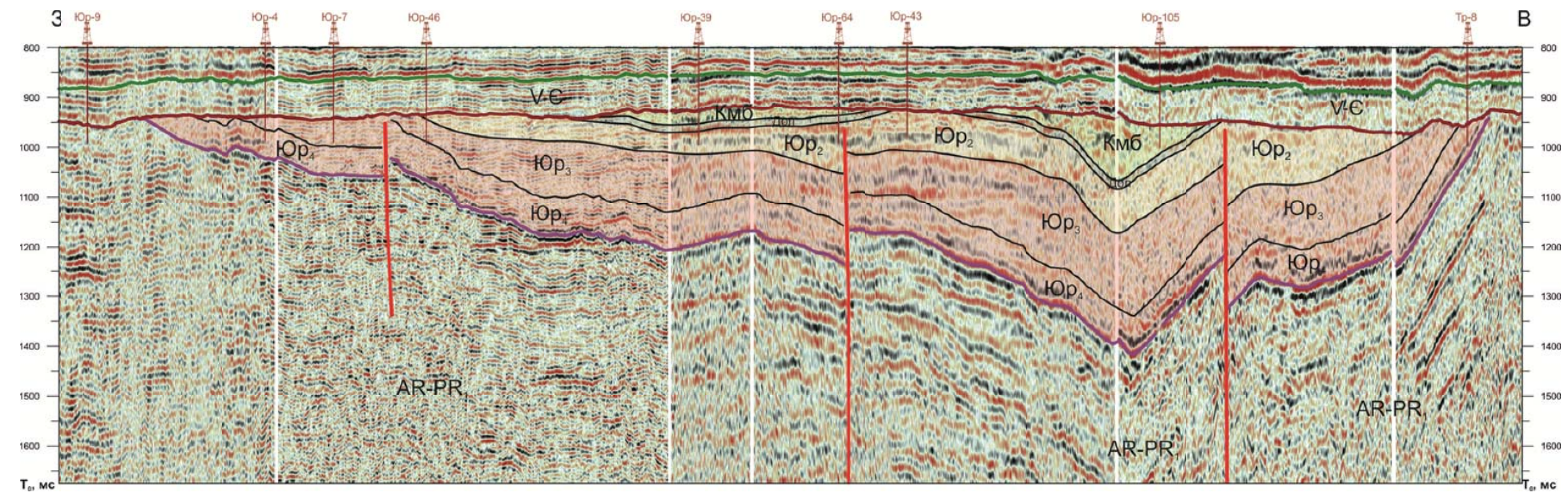 Литолого-стратиграфическая характеристика разреза. Юрубчено-Тохомское месторождение расположено в Восточной Сибири в пределах Сибирского кратона рядом с Байкитским сводом. Площадь находится между Саяно-Енисейским складчатым поясом на западе и Курейкской или Тунгусской впадиной на севере. В период между ранним протерозоем и средне-протерозойским – рифейским временем здесь произошло мощное рифтообразование. В рифейское время (возраст 1,65-0,65 млрд. лет) внутренняя часть кратона претерпела погружение, что привело к отложению серии осадочных циклов, состоящих из песчаников, карбонатов и глин на архейском – ранне-протерозойском фундаменте, представленном гранитами и гнейсами. Большая часть рифейского разреза в районе Юрубчено-Тохомского месторождения была затем размыта в течение нескольких сотен миллионов лет. Рифтовые процессы продолжались в вендское время (от 0,65 до 0,57 млрд. лет), затем последовало платформенное осадконакопление в фанерозое, в основном в течение палеозоя и триаса, в результате которого сформировались широко развитые по площади осадочные и вулканические свиты кембрийского, девонского и триасового возраста. В разрезе Юрубчено-Тохомского месторождения кембрий представлен мощной (1750-2500 м) толщей известняков, доломитов и в подчинённых количествах глин. Кембрийские эвапориты считаются здесь региональной покрышкой. Нижележащие вендские отложения расчленяются следующим образом: собинская свита – доломиты с прослоями вулканических пород; катангская свита – доломиты и доломитистые мергели; оскобинская свита – вулканогенные породы, песчаники и доломиты; ванаварская свита – песчаники, глины, алевролиты (красноцветы), брекчии с доломитами и гранитными обломками.