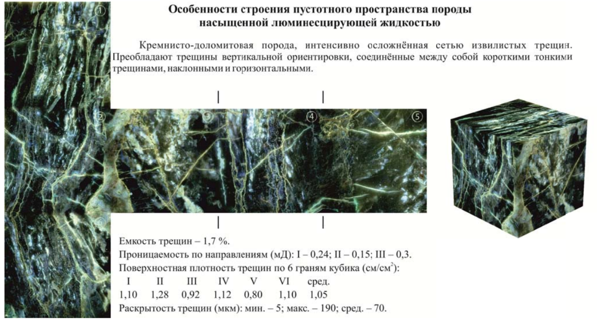 Кровля рифея представляет размытую поверхность, которую несогласно перекрывают вендские отложения. Проведённый анализ продуктивности скважин позволил установить, что наиболее перспективной является свита Юр3, которая отличается высокими дебитами нефти (до 600 м3/сут.) и газа (40-302 тыс. м 3/сут.), большой эффективной ёмкостью за счёт трещин и каверн и выдержанной толщиной в разрезе. Трещиноватость рифейских отложений Юрубчено-Тохомского месторождения развита интенсивно, но весьма неодинакова по разрезу. Трещины имеют различную морфологию, ориентировку, протяжённость и раскрытость. Роль трещин в формировании фильтрационно-емкостных свойств коллекторов рифейский отложений Юрубчено-Тохомского месторождения переоценить сложно, поскольку именно они являются проводящими каналами для миграции минерализованных растворов, способствующих выщелачиванию пород, и играют основную роль при фильтрации углеводородов. Следует подчеркнуть, что открытые микротрещины, широко развитые в продуктивной толще рифея, своим возникновением обязаны тектоническим процессам, но морфология, раскрытость и протяжённость их обусловлены литогене- тическими особенностями образования пород и дальнейшим движением по ним подземных вод. Детальные исследования характера трещиноватости позволили сделать вывод, что породы рифея макро- и микротрещиноваты. Преобладают разноориентированные трещины, часто образующие сложную систему, которая и обеспечивает высокие фильтрационные характеристики пород-коллекторов. Вдоль трещин отмечены многочисленные пустоты выщелачивания. Протяжённые секущие трещины осложнены короткими и тонкими, за счёт чего обеспечивается их взаимосвязь. Вертикальные трещины, как правило, прямые, горизонтальные секущие слабоизвилистые, оперённые короткими. Именно протяжённые вертикальные и горизонтальные трещины обеспечивают высокую фильтрацию флюидов (проницаемостью более 1 Дарси) и соединяют кавернозные прослои (пористость до 10-15 %) и редкие крупные каверны объёмом 10-20 см3 (общая эффективная ёмкость 2-3 %). Отличительной особенностью трещин в рифейских отложениях Юрубчено-Тохомского месторождения является значительное удаление их друг от друга, т.е. широкий «шаг» – расстояние между ними составляет 3-5 см, иногда более. Удалённость трещин друг от друга определяет сложность их выявления и определения фильтрационно-емкостных свойств стандартными методами, именно поэтому применяется метод капиллярной дефектоскопии, основанный на 5 см образцах кубической формы. Метод даёт объёмную характеристику геометрии пустот в породе.