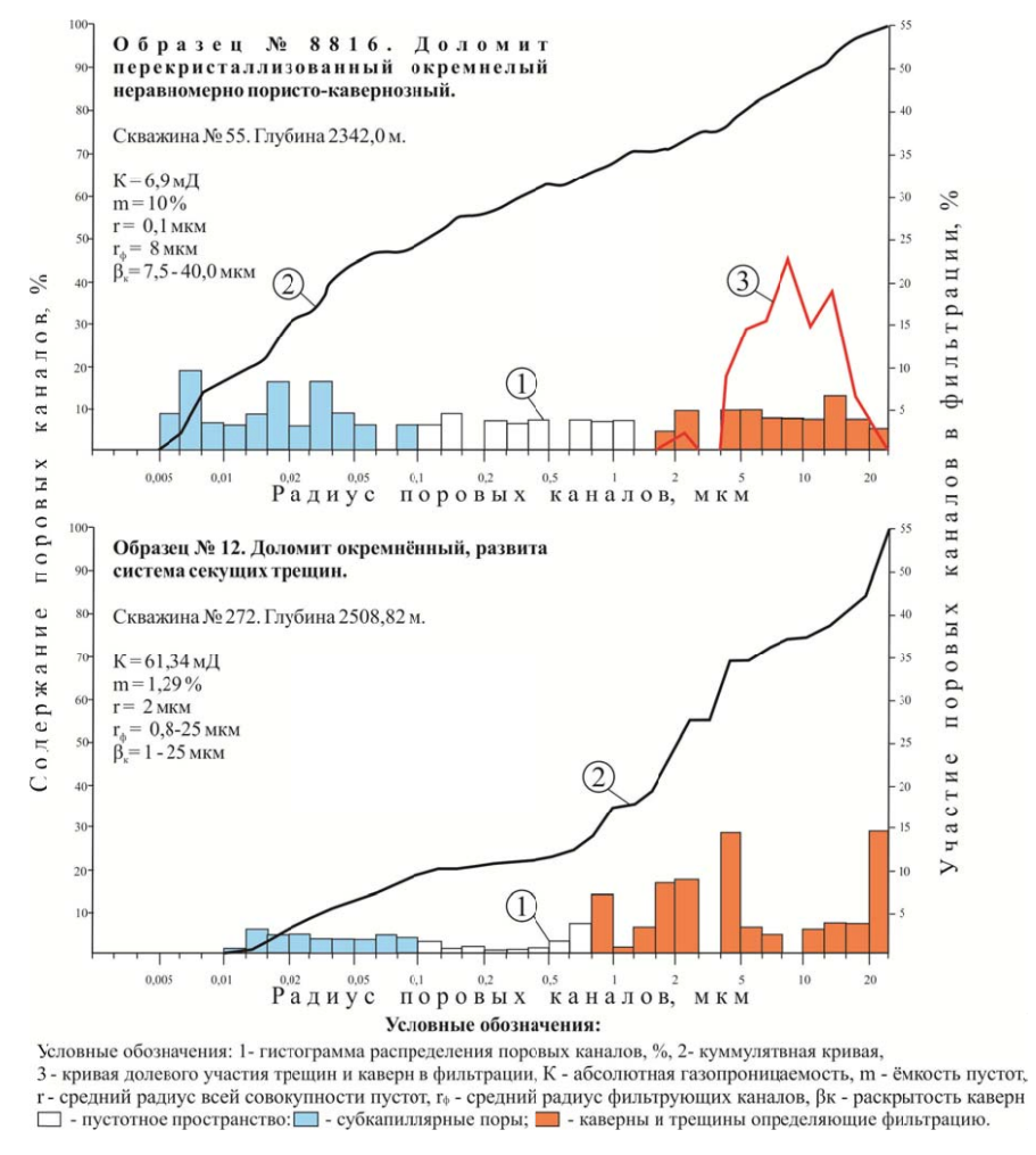 Результаты исследований различных строений порового пространства рифейских доломитов приведены в виде порометрических кривых.