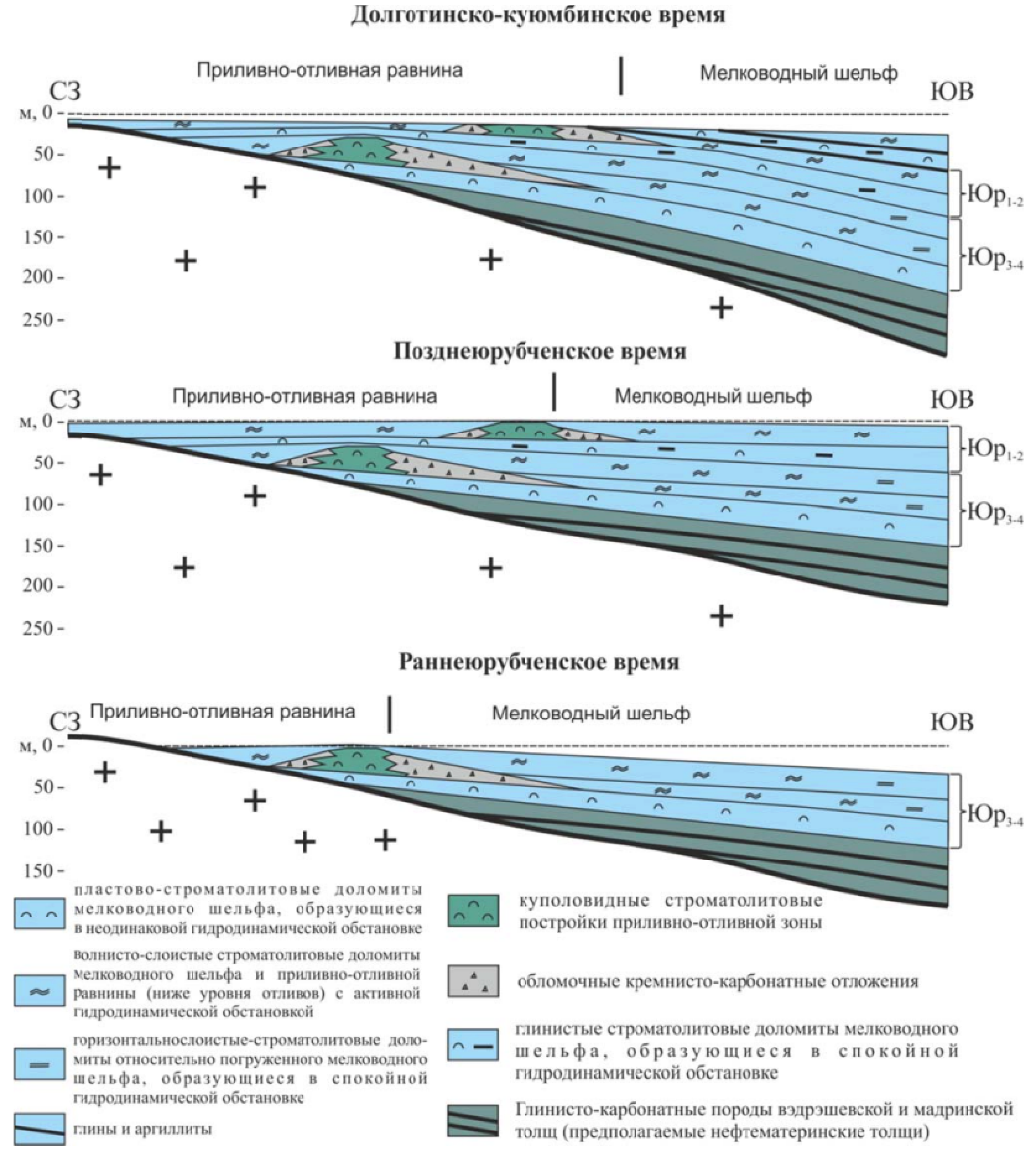 1. Юрубченское время: Условия: Крайнее мелководье, непостоянный гидродинамический режим, частые колебания уровня моря. Породы: Преимущественно пластовые строматолитовые доломиты. Процессы: Отложения неоднократно осушались, что приводило к их выщелачиванию, окремнению и перекристаллизации. Формировались обломочные разности и предположительные иловые постройки. Поздний этап: На востоке зоны произошло погружение бассейна, накапливались слабоглинистые доломиты с прослоями аргиллитов.