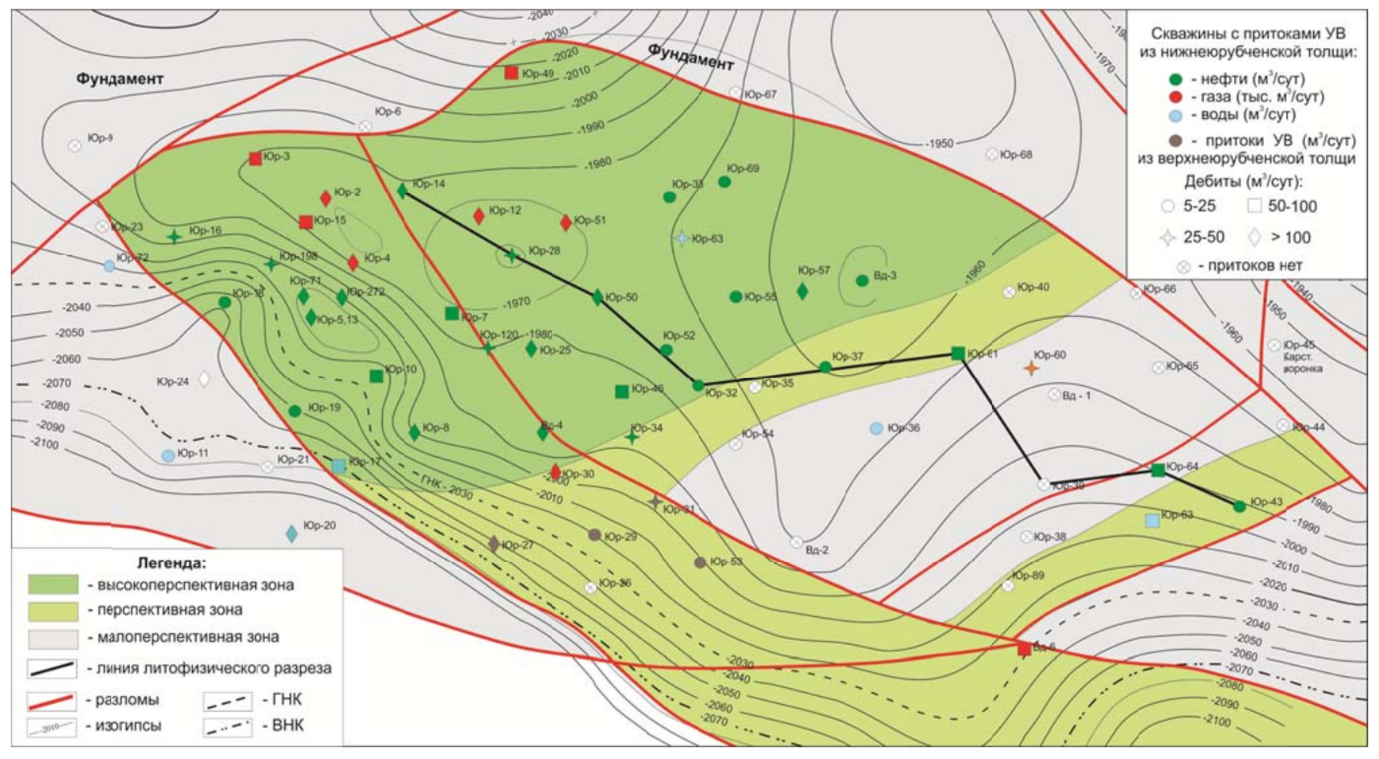 Горизонт Р1-2Д рассматривается наиболее подробно, так как с входящей в него Юрубченской толщей связана наибольшая нефтегазоносность района. Границы горизонта отделяются от вышележащих пластов преимущественно глинистыми толщами рифея – копчерской и токурской. Пласт РI-2Д имеет наибольшую площадь распространения: площадь газовой шапки составляет 528,1 км2 (69 % от общей), водонефтяная зона равна 228,3 км2 (29,8% от общей), водонефтегазовая зона – 465,4 км2 (60,8 %), нефтяная зона – 8,5 км2 (1,1 %), нефтегазовая зона – 23,5 км2 (3,1 %). Залежь приуро- чена к доломитам Юрубченской толщи, тип залежи – массивный, тип коллектора – каверново-трещинный. Максимально высокие (более 100 м3/сут.) дебиты нефти из пласта Р1-2Д получены в скважинах №№ Юр-5, 5б, 5вг, 8, 14, 22, 24, 25, 50, 57, 71, 1046, 1061 и Вдр-4. Максимально высокие (более 100 тыс. м 3/сут.) дебиты газа из пласта Р1-2Д получены в скважинах №№ Юр-4, 12, 16, 25, 28, 33, 48, 49, 50, 51 и Вдр-4. По результатам испытания и данным ГИС уровень ГНК принят на абсолютной отметке – 2023 м, ВНК − 2072 м. С юга залежь ограничена пересечением ВНК с эрозионной поверхностью рифея, являющейся кровлей для толщи коллекторов. Северо-западная граница связана с выходами на эрозионную поверхность древних глинистых отложений рифея, в центральной части северная граница залежи связана с тектоническим нарушением, по которому в северном (поднятом) блоке на эрозионную поверхность также выходят древние глинистые отложения рифея и фундамент. На востоке граница проходит по линии выхода на эрозионную поверхность отложений глинистой пачки в долгоктинской толще.