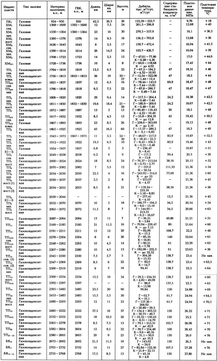 На месторождении на начало 1995 г. пробурено 55 скважин, в результате чего был вскрыт разрез мезокайнозойских пород до нижнеюрского возраста включительно (рис. 1) на максимальную глубину более 3800 м (отложения лайдинской свиты). Общая характеристика нижнемелового-сеноманского разреза месторождения отражена на рис. 4.3. Открыты залежи УВ в отложениях марресалинской (пласты ПК1, ХМ1, ХМ2, ХМ3, ХМ3/1), танопчинской (ТП1, ТП2/0, ТП2, ТП3, ТП4/0, ТП4, ТП5, ТП7, ТП8, ТП9, ТП10/0, ТП11, ТП12, ТП13/0, ТП13, ТП14, ТП16, ТП18, ТП19, ТП19/2, ТП20/0, ТП20, ТП21-23) и ахской (БЯ10, БЯ11, БЯ13-14) свит (табл. 1).