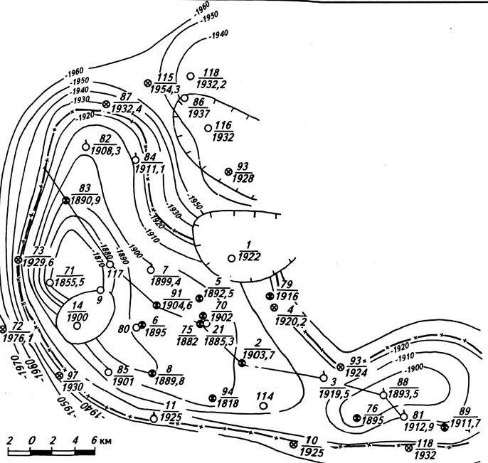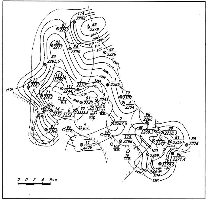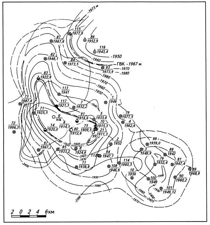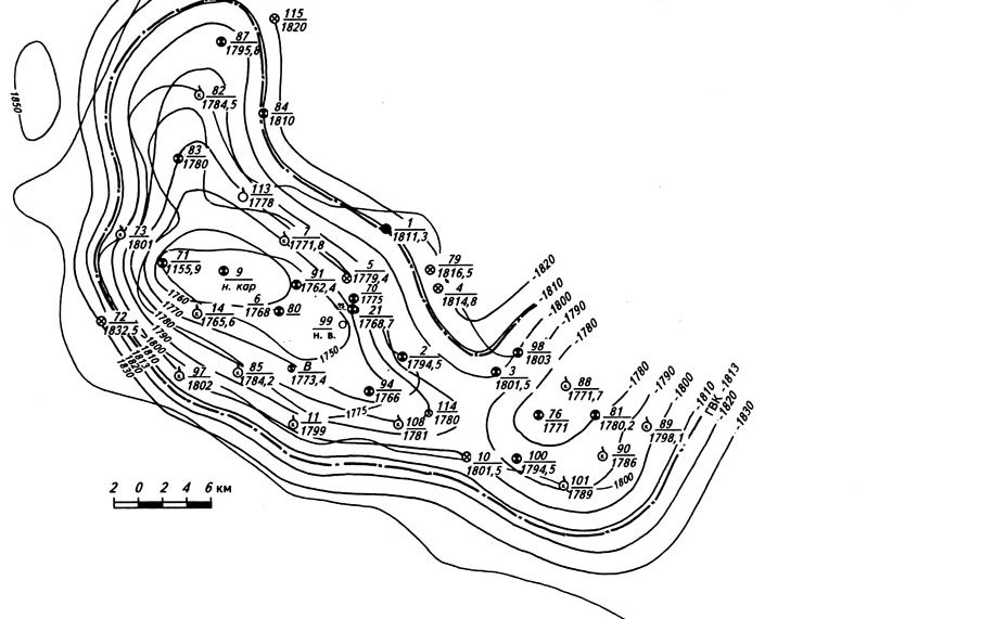 Рис.4. Структурная карта по кровле пласта ТП5 Южно-Тамбейского месторождения (Геологический отчет ГГП «Ямалнефтегазгеология» за 1991 г. Салехард, 1992 г.)