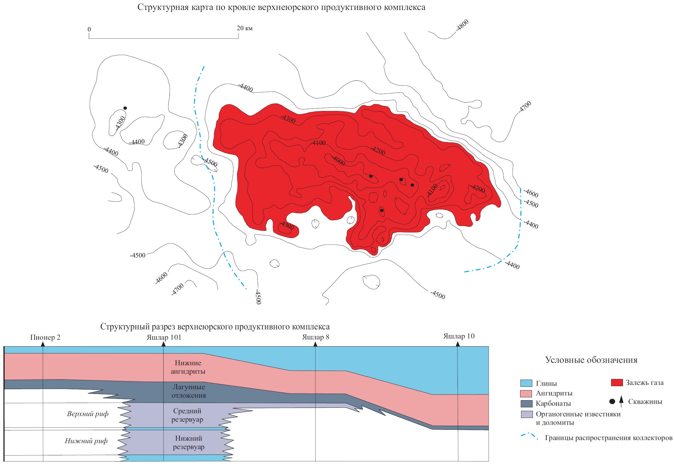 Газовое месторождение Яшлар расположено в Амударьинском НГБ, в120 км к восток-юго-востоку от г. Мары, на северном борту Сандыкачанской зоны прогибов. Открыто в 2004 г. Связано со сложнопостроенным поднятием кровли известняков субмеридионального простирания по замкнутой изогипсе -4350 м размером 40х14 км (рисунок 1). Притоки газа получены из верхнеюрского продуктивного комплекса, сложенного органогенными известняками и доломитами нижнего и верхнего рифа, лагунными осадками, которые перекрываются ангидритами.