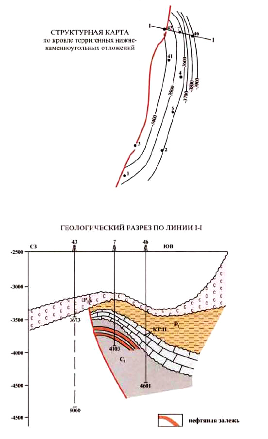 Установлена продуктивность терригенных нижнекаменноугольных отложений. Коллекторами являются песчаники и алевролиты с пористостью 7-16% и проницаемостью 0,042-0,00048 мкм2. Эффективная нефтенасыщенная толщина составляет 6,6-33 м, коэффициент нефтенасыщенности 0,7. Дебит нефти (скв. 7) составил 7,2-8,3 м3/сут. Нефть имеет плотность 852 кг/м3, содержит 0,32% серы, до 13% парафина и 3% смол и асфальтенов.