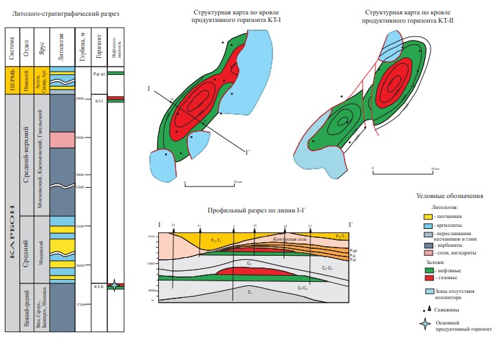 Верхняя продуктивная толща KT-I сложена органогенно-обломочными известняками, доломитами и их переходными разностями. Встречаются редкие прослои глин. Толща включает четыре продуктивных пачки: А, Б, В и В1. Первые три пачки развиты по всей площади структуры, пачка В1 ограничена распространением в сводовой части северного купола (блок III). Строение и характер насыщения продуктивных пачек в целом по толще КТ-1 позволяют объединить их в единую массивно-пластовую залежь с едиными ГНК (-2560 м) и ВНК (-2663:2650 м). Коллекторы толщи КТ-1 - поровокаверновые, пористостью 11-14% и проницаемостью 0,080-0,170 мкм2. Высота нефтяной части залежи достигает 100 м, газоконденсатной - 200 м. Покрышкой являются глинистые породы нижней перми и галогенная толща кунгура.