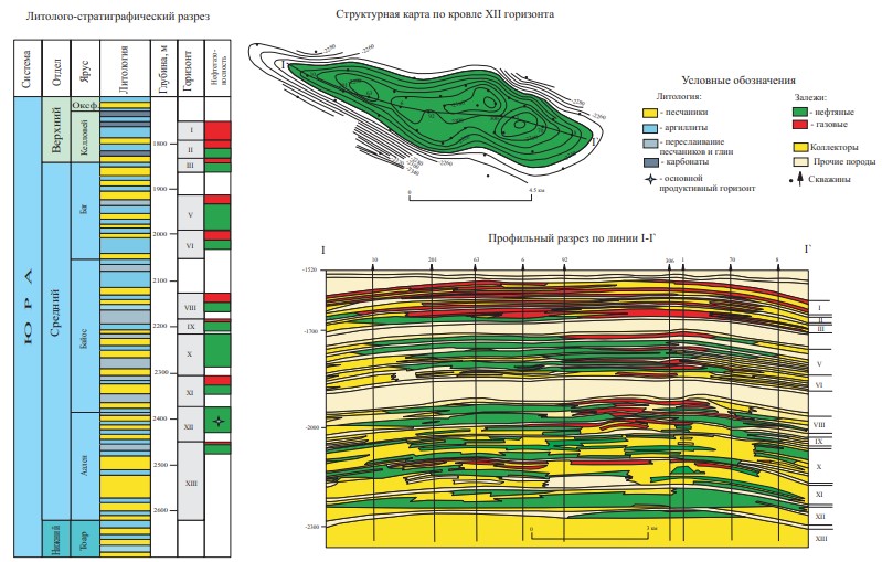 Продуктивны отложения верхней и средней юры, в которых установлено 13 горизонтов, представленных переслаивающимися песчаниками, алевролитами и глинами (рисунок 1).