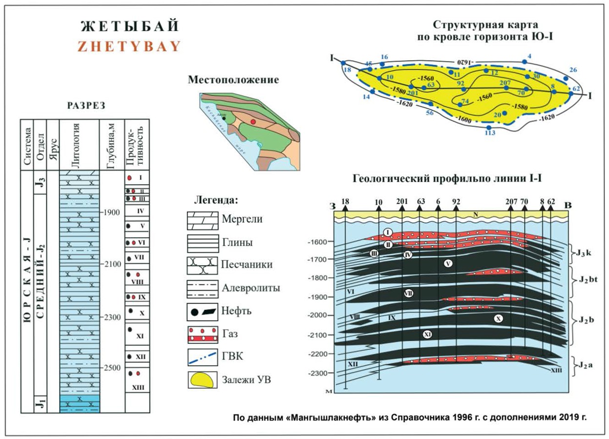 Нефтегазовое месторождение Жетыбай расположено в 80 км юго-восточнее г. Актау, на Жетыбай-Узеньской ступени Северо-Кавказко-Мангышлакского нефтегазоносного бассейна. Структура выявлена в период проведения региональных геологогеофизических работ 1952-1956 гг. В последующие годы (1956-1960 гг.) проведены сейсморазведочные работы и структурное бурение, детализировавшие строение выявленного поднятия. Поисковое бурение начато в 1959 г. Месторождение открыто в 1961 г. Первооткрывательница - скв.6.