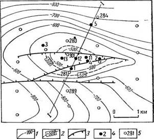 Рис. 1. Задорненское газовое месторождение. Структурная карта по кровле нижнего палеоцена. Составил Ю. X. Овчаренко. 1 — изогипсы кровли продуктивного горизонта, м; 2 — положение контура газоносности; 3 — дизъюнктивные нарушения; 4 — разведочные и эксплуатационные скважины; 5 — структурнопоисковые скважины