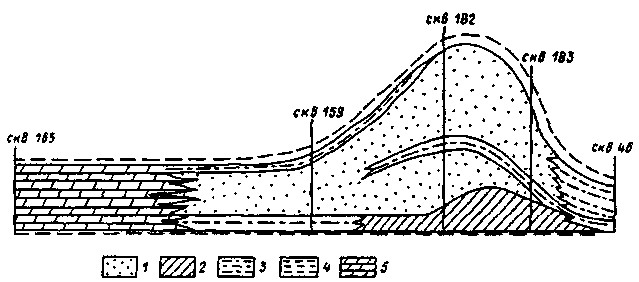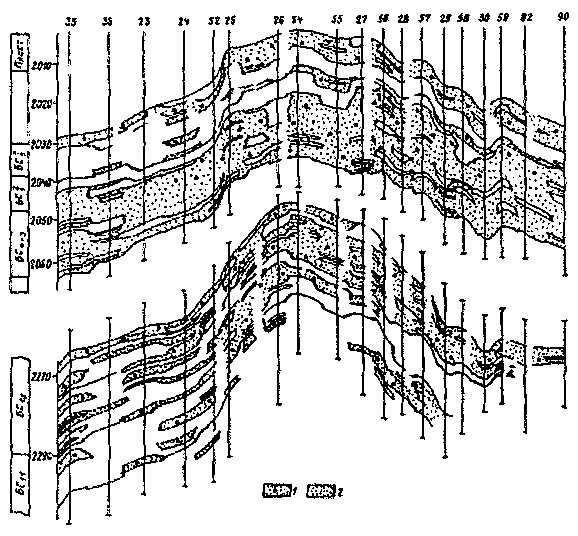 Рис. 2. Западно-Сургутское нефтяное месторождение. Геологический профиль продуктивных отложений: 1,2 — песчаники соответственно нефте-, водонасыщенные