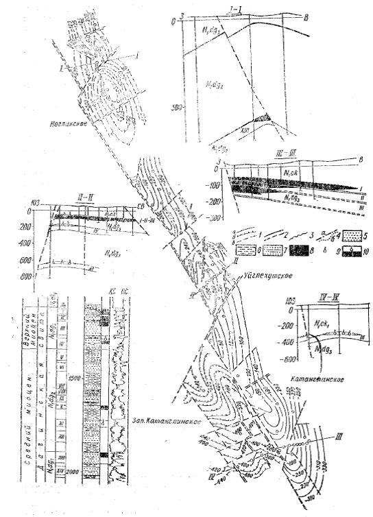 Рис.1. Катанглинское, Лысая Сопка (Ногликское), Уйглекутское нефтяные и Западно-Катанглинское газовое месторождения. 1- изогипсы по кровле: а- IV пласта, б- пласта IIIа (мощного пропласта в средней части III пласта), в- Х пласта; 2- разрывы, 3- поверхность несогласного залегания; 4- контуры: а- нефтеносности, б- газоносности, 5,6,7- песчаные, глинистые, песчано-глинистые породы, 8- нефть, 9- газ, 10-нефть и газ.