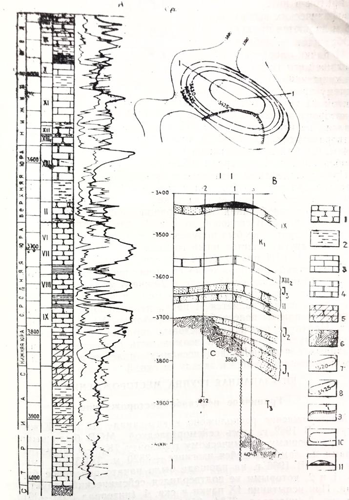 А- литолого-стратиграфический разрез; Б- структурная карта по кровле IX пласта нижнего мела; В- профильный геологический разрез. 1- песчаники; 2- глины; 3- известняки; 4- доломиты; 5- песчаники глинистые; 6- сланцы карбона; 7- изогипсы отражающего сейсмического горизонта;8- изогипсы кровли IX1 пласта нижнего мела; 9- линия выклинивания коллектора; 10- контур нефтеносности; 11- нефтяная залежь.
