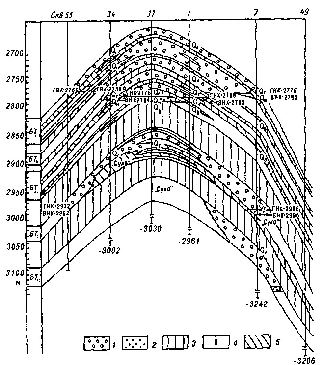 Рис. 1. Заполярное газоконденсатнонефтяное месторождение. Геологический разрез: 1 — газ; 2 — нефть; 3 — непроницаемые прослои между пластами; 4 — интервал перфорации; 5 — непроницаемые прослои внутри продуктивных пластов