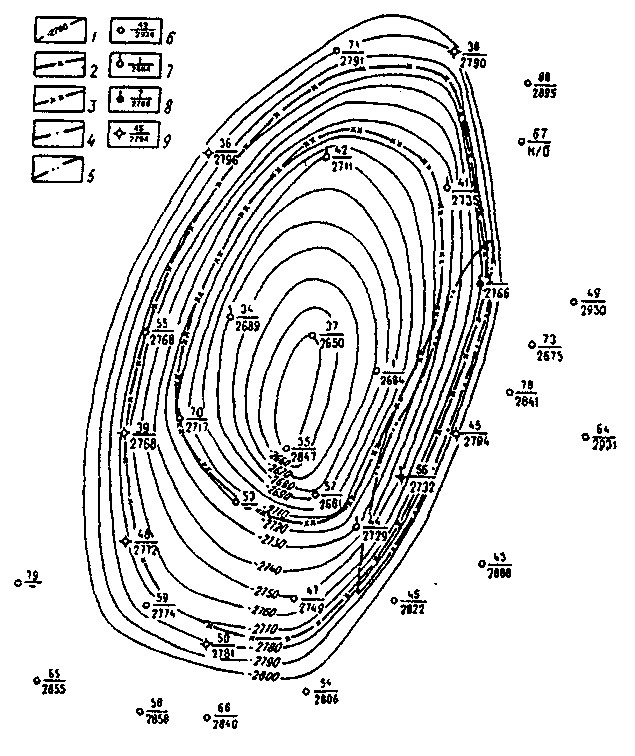 Рис.2. Заполярное газоконденсатнонефтяное месторождение. Струк­турная карта кровли пласта БТ3-4 : 1 — изогипсы кровли пласта БТ3-4, м; контур газоносности: 2 — внешний, 3 — внутренний; контур нефтенос­ности: 4 — внешний, 5 — внутренний; 6 — в числителе дроби номер скважины, в знаменателе — абсолютная отметка кровли пласта БТ3 4, м; скважины, давшие: 7 — газ, 8 — нефть, 9 — воду